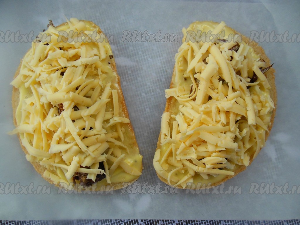 Посыпьте сыром бутерброды со шпротами.