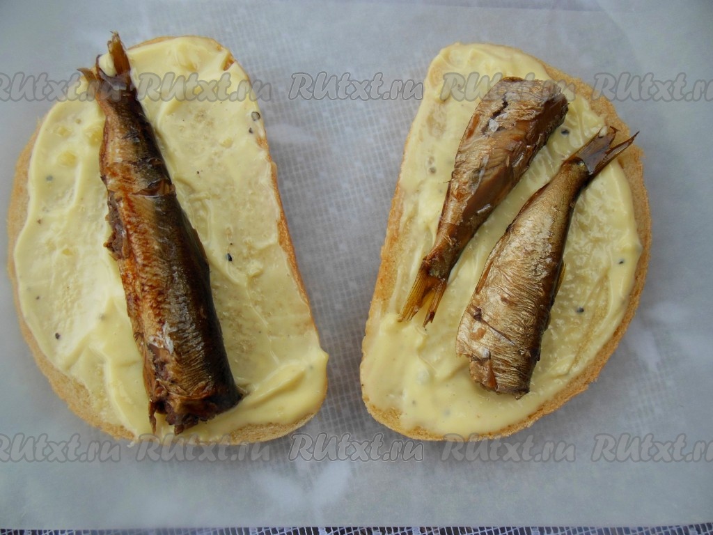 Откройте банку со шпротами, масло слейте. Если рыбка крупная, на каждый бутерброд положите по 1 рыбке, если мелкая - по 2.