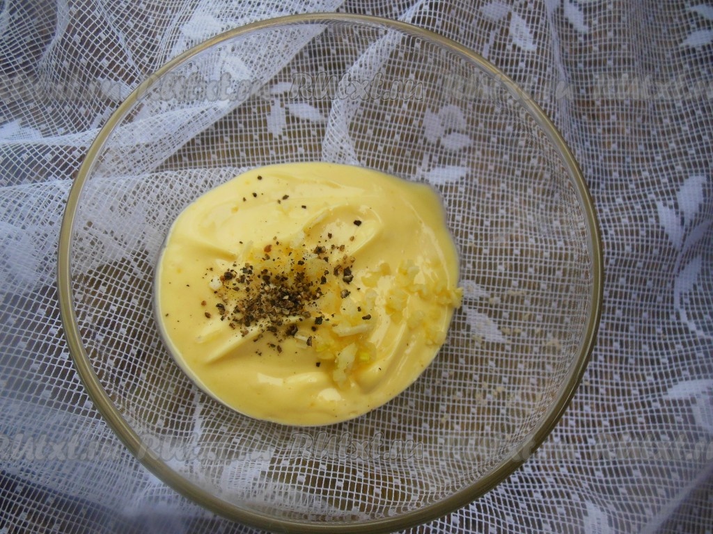 Нарежьте белый хлеб на равные кусочки (я купила уже нарезанный хлеб). Для приготовления соуса добавьте в майонез мелко измельченный чеснок, щепотку черного молотого перца, перемешайте.