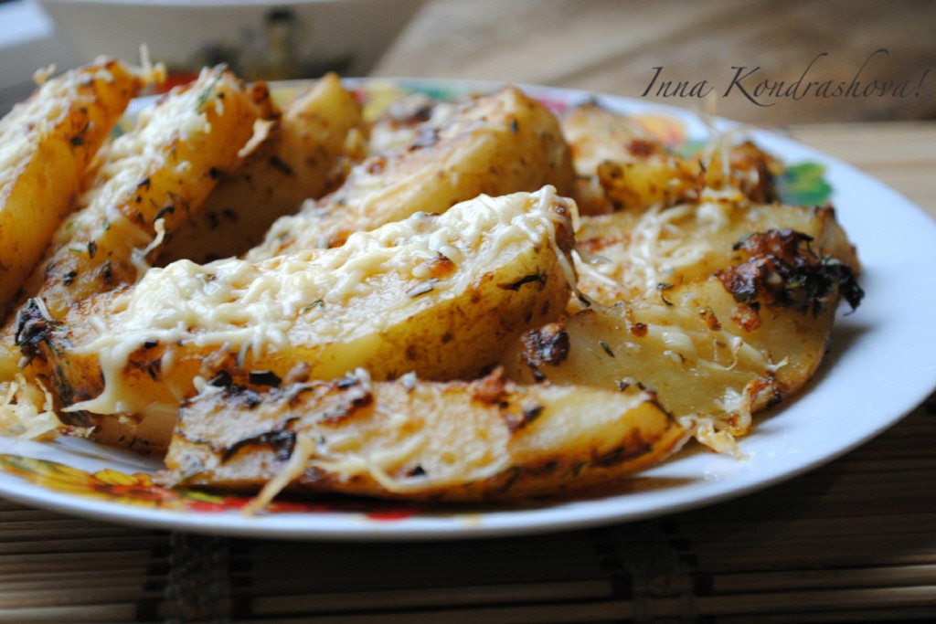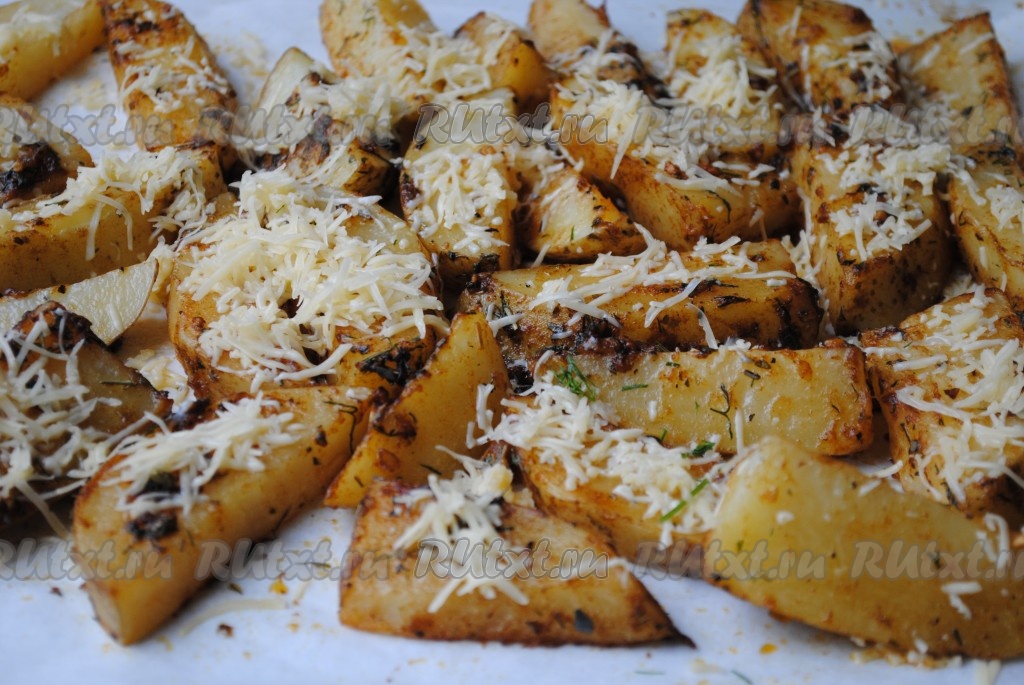 Затем достать противень с запечённой молодой картошкой из духовки, посыпать натёртым сыром. Запекать ещё 10 минут (до румяной сырной корочки).