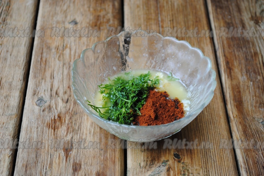 В небольшой ёмкости растопленное остывшее сливочное масло соединить с солью, специями, выдавленным через пресс чесноком, мелко нарезанным укропом.
