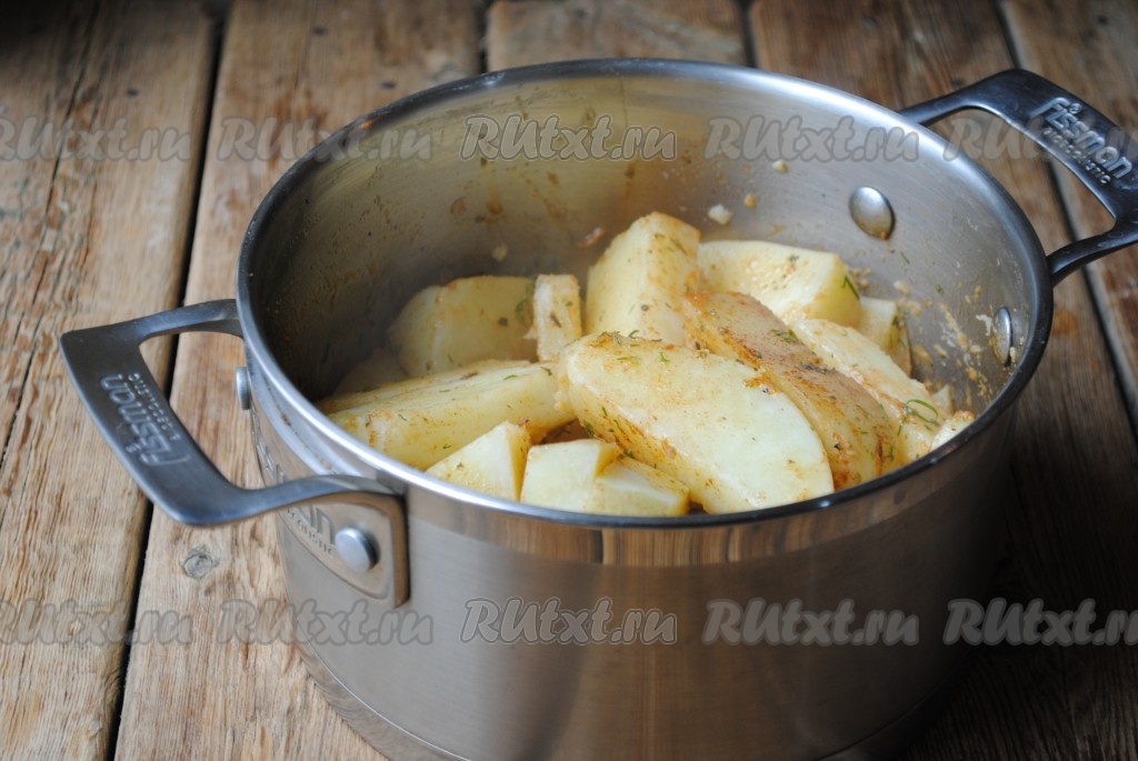 Накрыть кастрюлю крышкой и аккуратно встряхнуть, чтобы ароматная смесь равномерно распределилась по ломтикам картофеля.