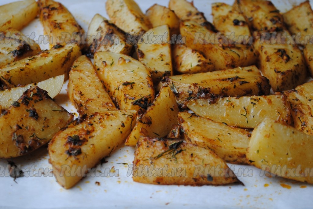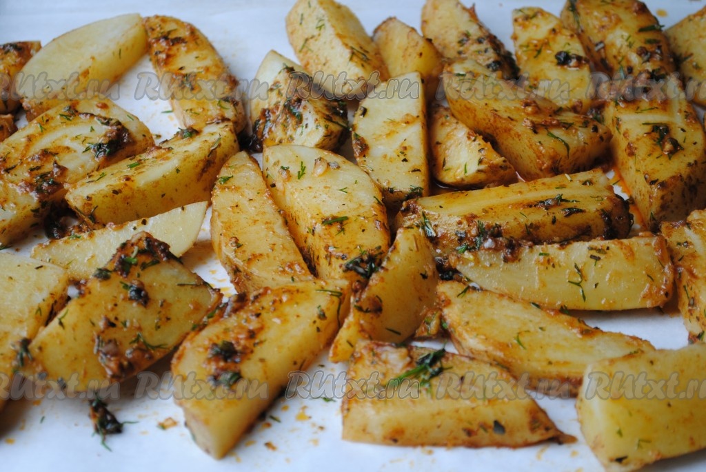 Противень застелить пергаментом, выложить картофель в один слой.