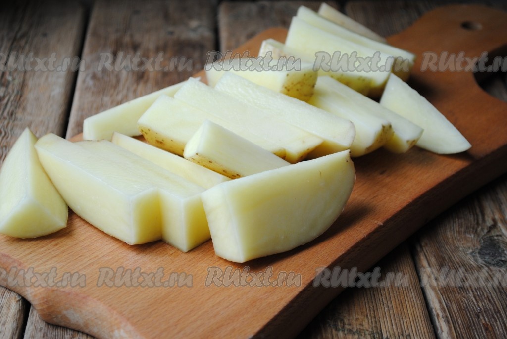 Молодой картофель хорошо вымыть. Не очищая, нарезать на крупные брусочки.