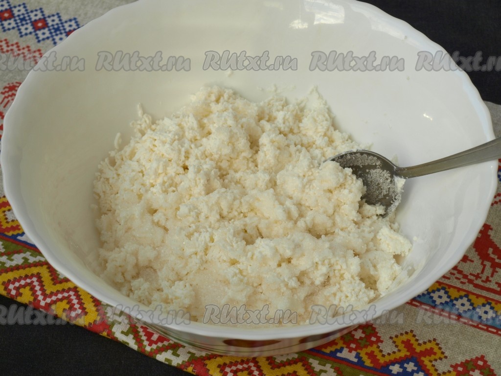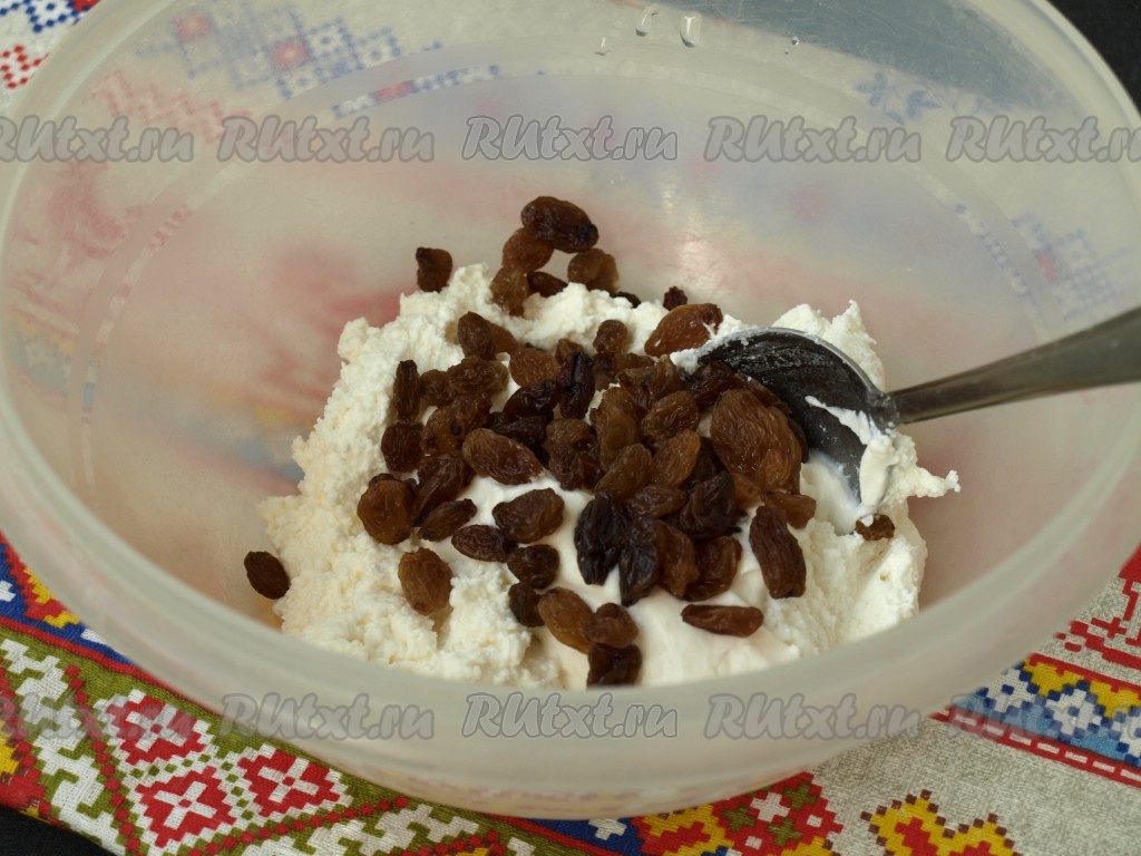 Разделить творожную массу на две части. В одну часть добавить щепотку ванилина, сметану, промытый и обсушенный изюм, хорошо перемешать.