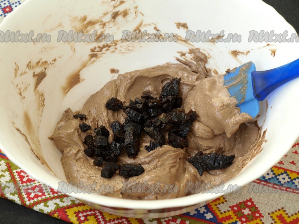 Во вторую часть творожной массы добавить получившуюся шоколадную массу, взбить до однородности блендером. Добавить измельчённый чернослив и снова перемешать.