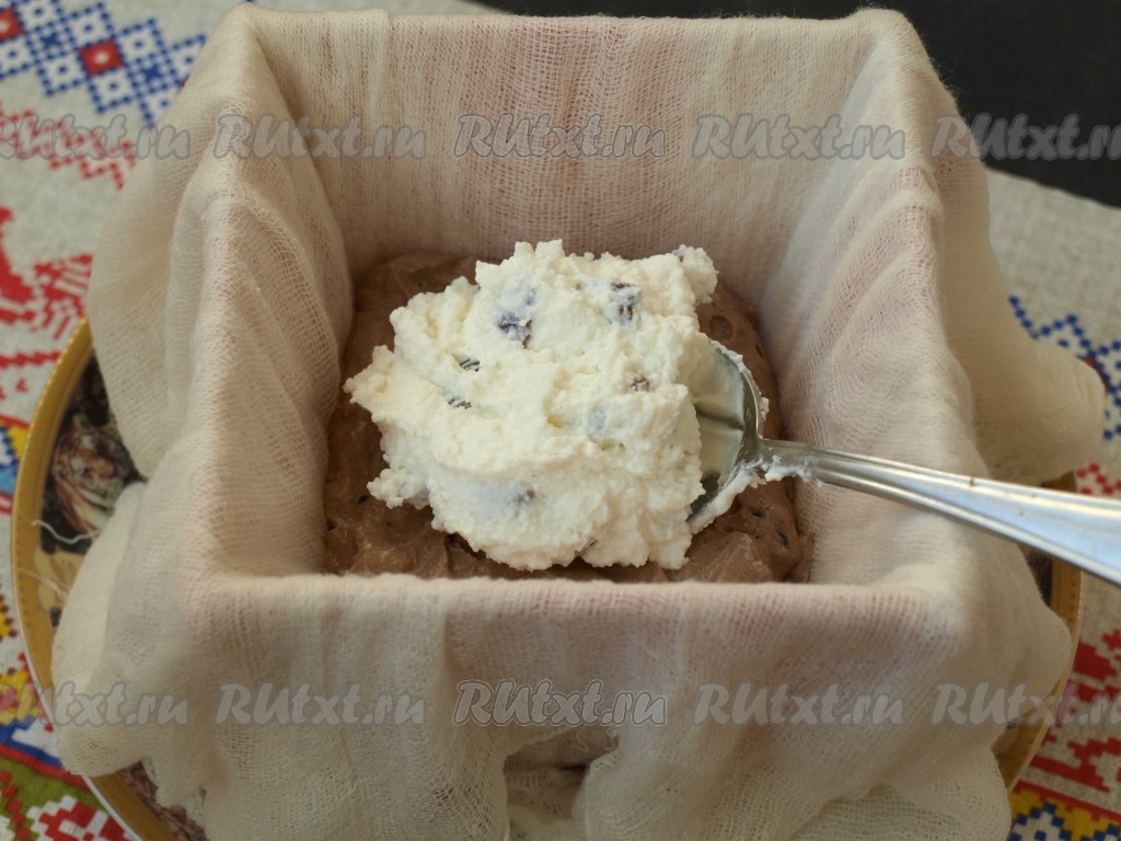 Пасочницу застелить влажной марлей и поставить в тарелку. Ложкой в пасочницу выложить часть белой массы, затем сверху добавить часть шоколадной массы, затем снова - белую и так продолжать чередовать слои до самого верха, пока не закончатся творожные массы.