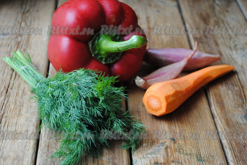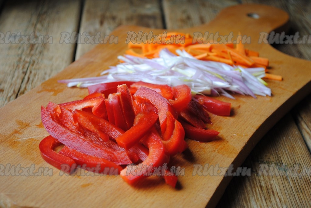 Овощи вымыть, болгарский перец очистить от семян, морковь и лук очистить. Лук нарезать полукольцами, перец и морковь - брусочками.