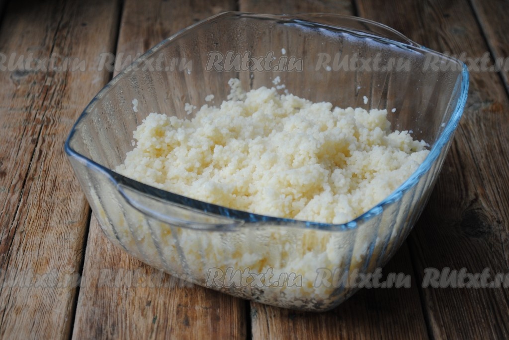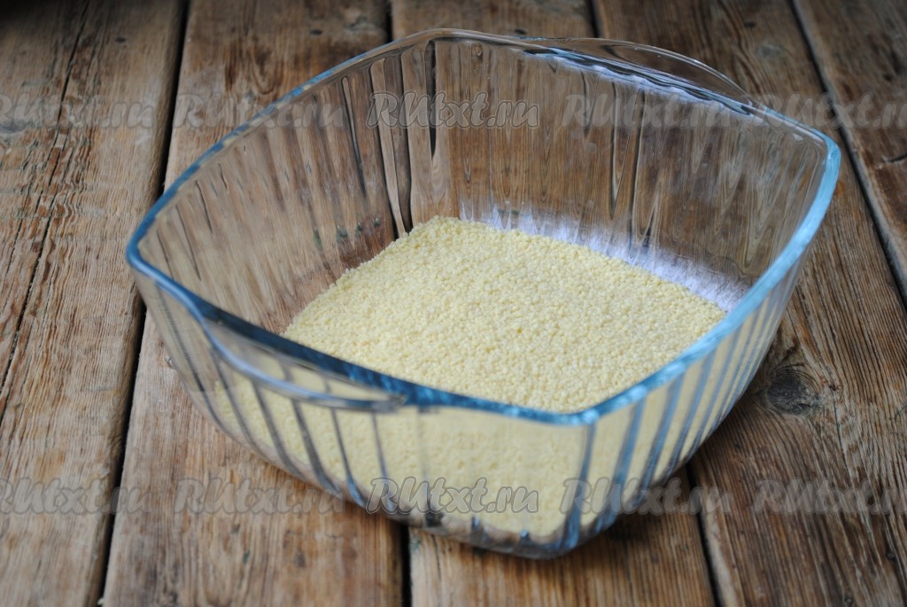Залить кускус кипятком, накрыть миску крышкой и оставить на 10 минут, чтобы крупа набухла.