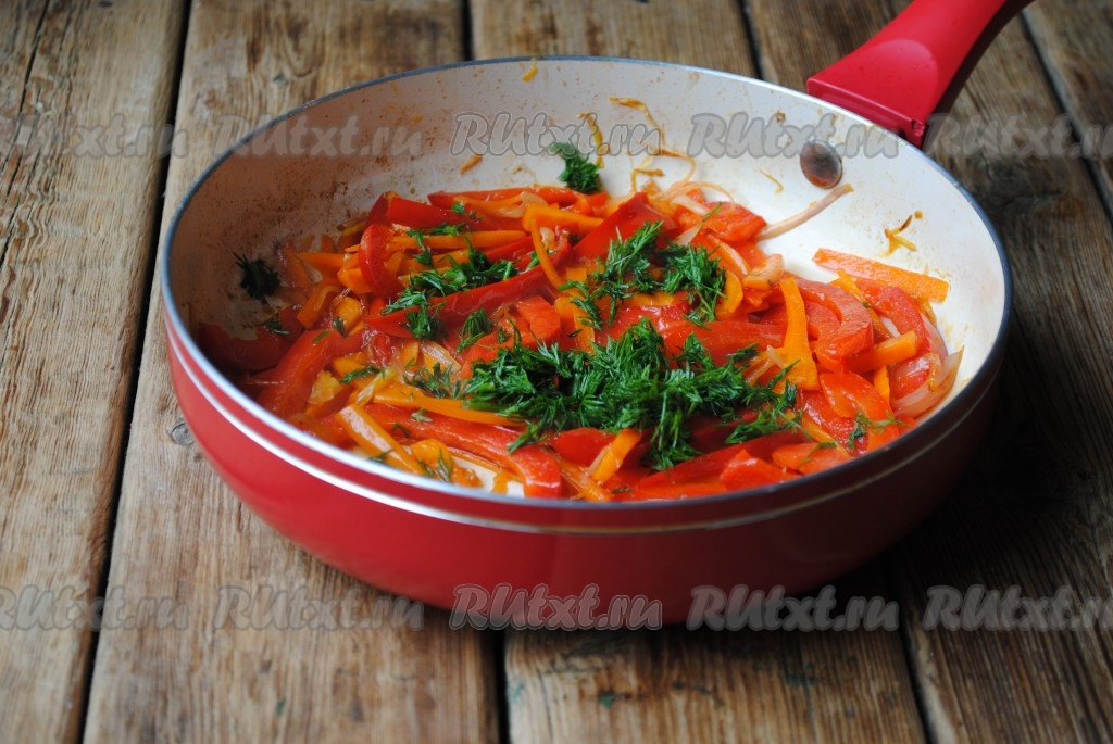 В сковороде разогреть растительное масло, выложить лук, морковь и перец.