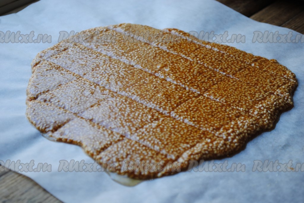 На стол положить лист пергамента и вылить на него грильяжную массу. Накрыть вторым листом пергамента и прокатать скалкой. Это нужно делать быстро, пока кунжутный грильяж не начал застывать. Толщина пласта - не более 3-4 мм. Пока пласт ещё мягкий, нужно ножом нанести насечки, по которым потом будем разрезать конфеты.