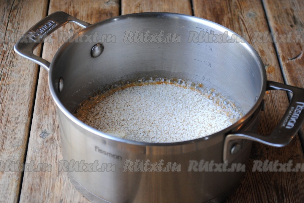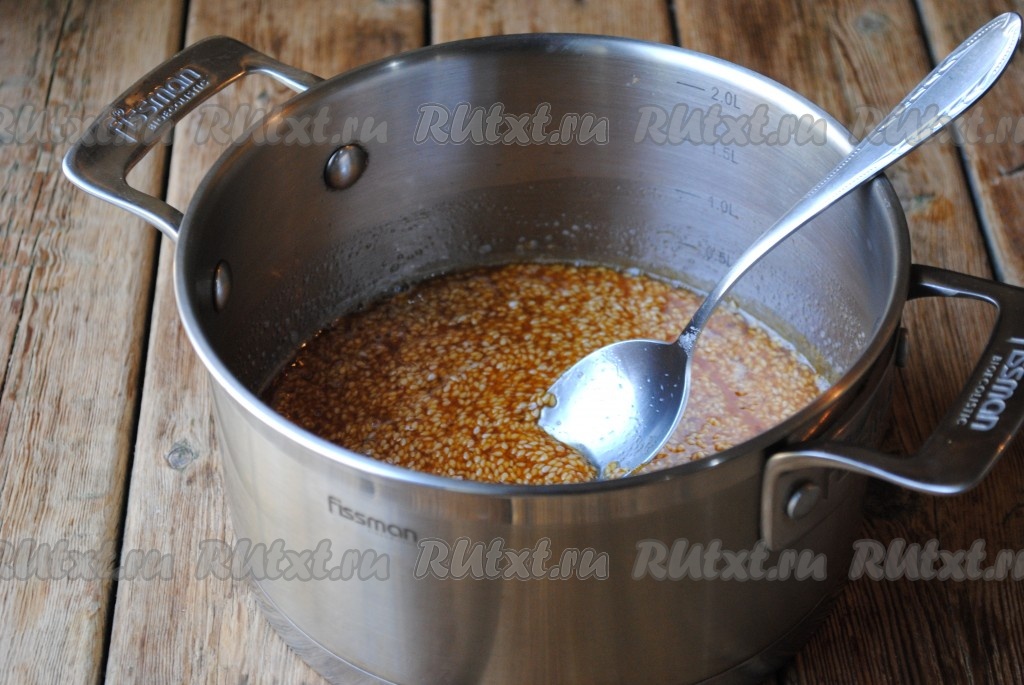 Всё хорошо перемешать, чтобы кунжут был полностью покрыт карамелью.