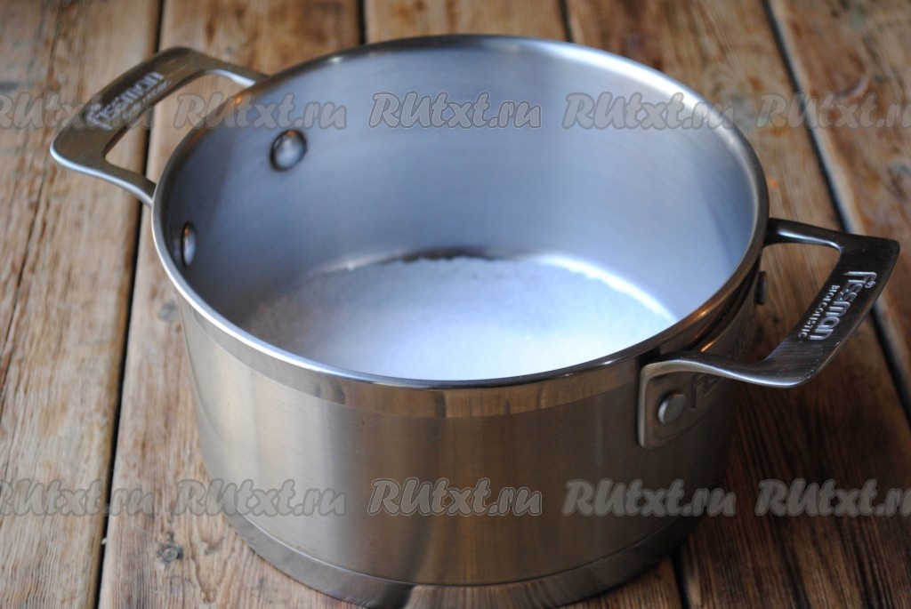 Сахар насыпать в кастрюлю или сотейник. Отправить на огонь.