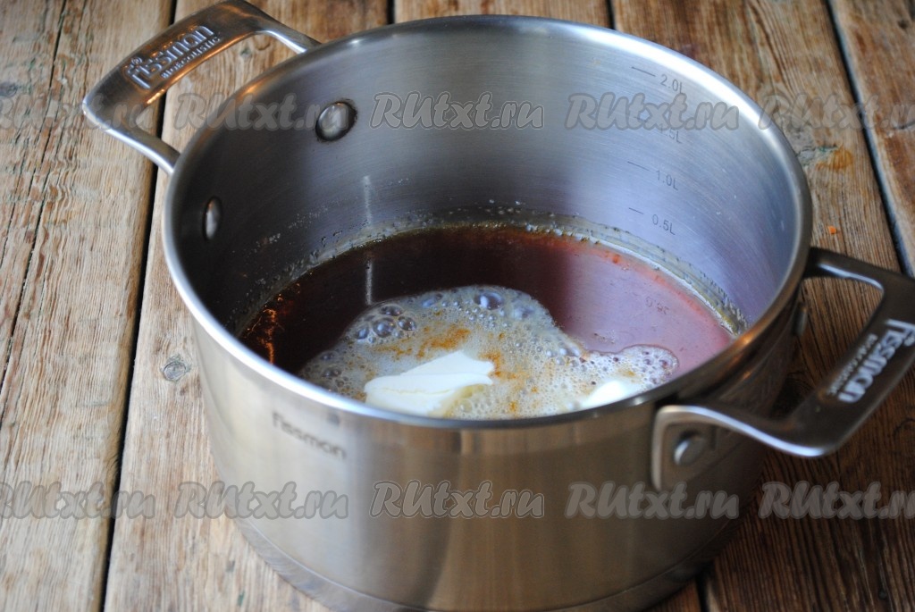 Снять карамель с огня и добавить в неё мягкое сливочное масло.