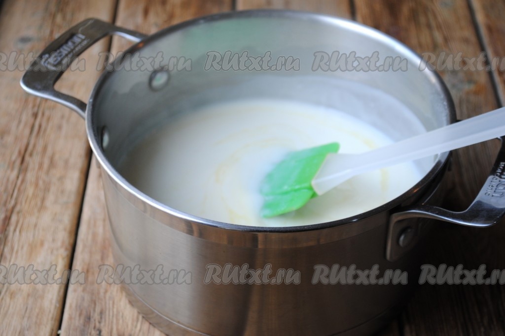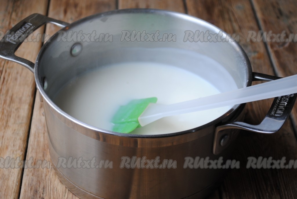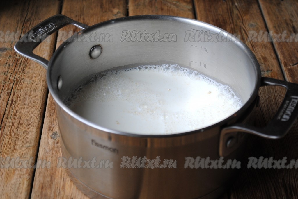 Всё перемешать и отправить кастрюлю на огонь. Постоянно помешивая, довести молочную смесь до кипения на среднем огне.