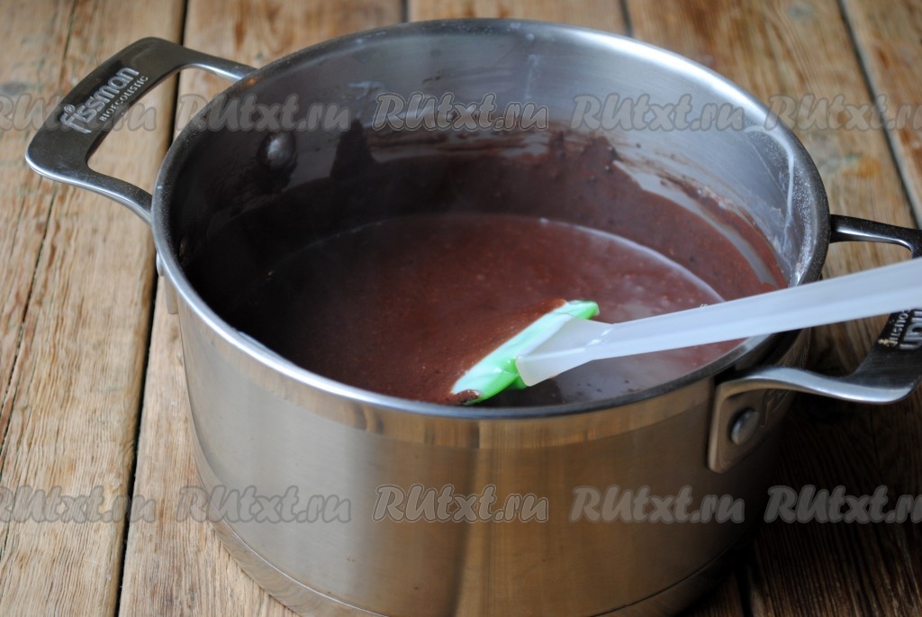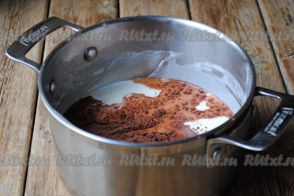 Отправить смесь молока и какао на огонь и проварить 1 минуту, постоянно помешивая, затем снять с огня. Должна получиться однородная шоколадная масса без комочков, если же комочки появились - массу можно протереть через сито или же пробить блендером.