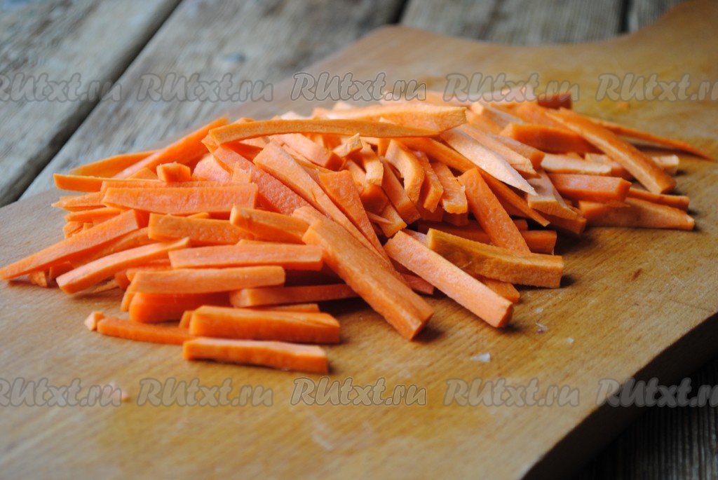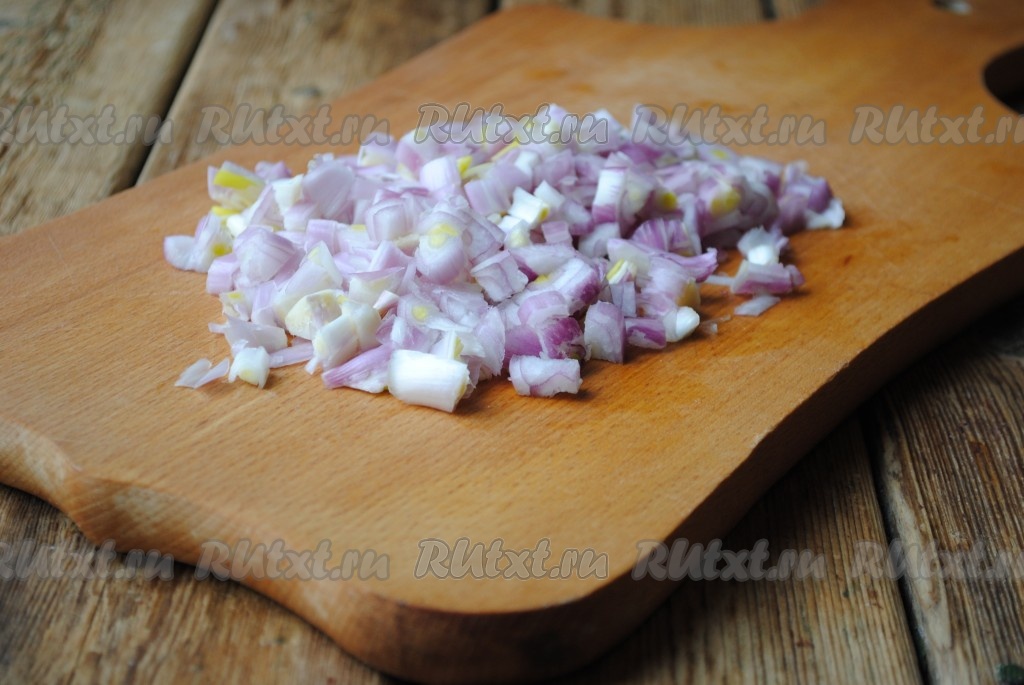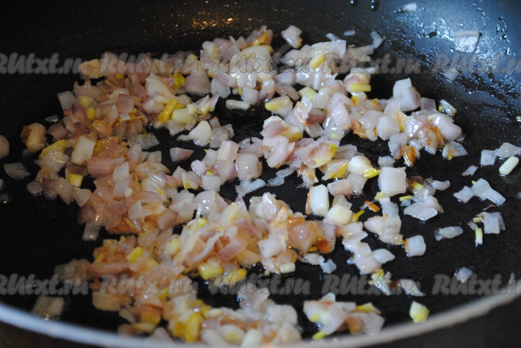 В глубокой сковороде или казане разогреть растительное масло, выложить нарезанный лук и обжарить, помешивая, минуты 3-4 (до золотистого цвета).