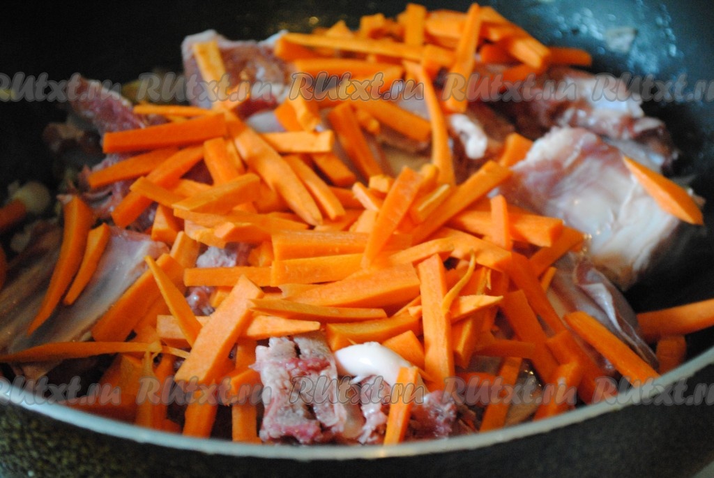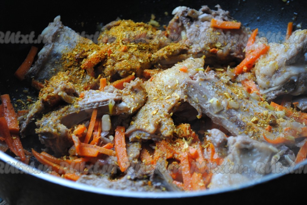 Перемешать лук, морковь и мясо, затем добавить соль и приправу к плову.