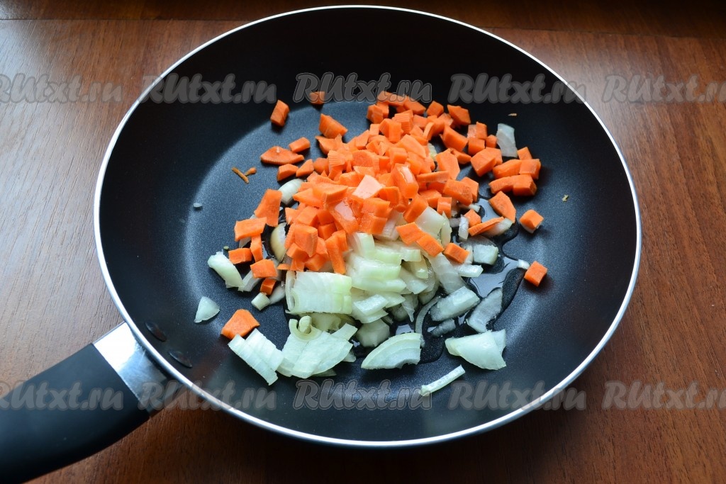 Лук и морковь нарезать маленькими кубиками, поместить в сковороду с растительным маслом.