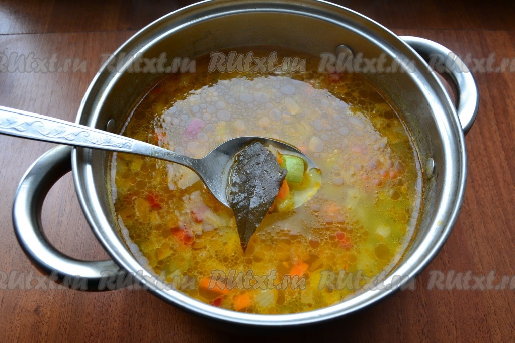 Далее добавить измельченный чеснок и лавровый лист, проварить суп еще 5 минут и выключить газ.