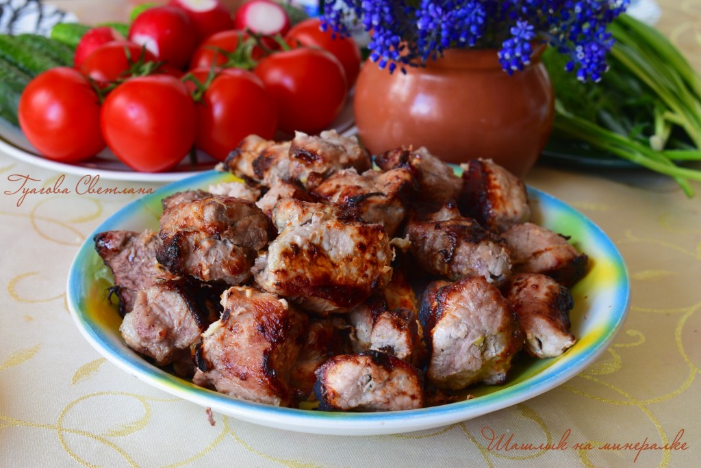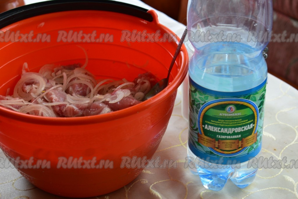 Благодаря минералке, наш шашлык маринуется с минимальным количеством уксуса и получается сочным и очень вкусным.