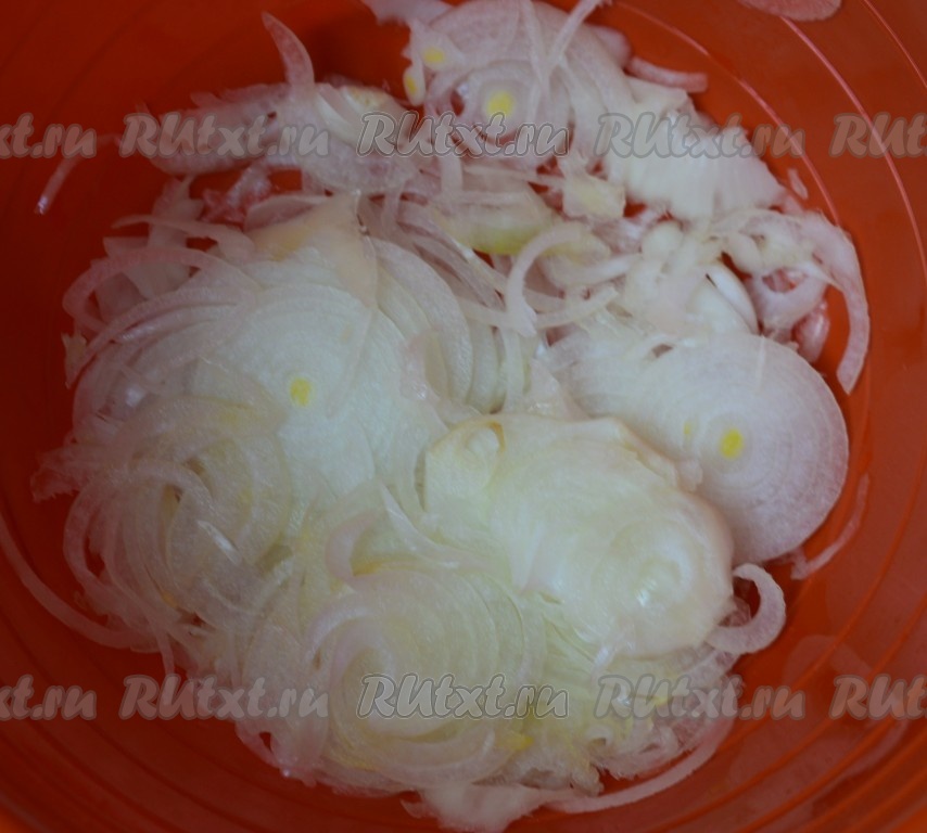 Очищенный лук нарезать тонкими кольцами, отправить к мясу и хорошо перемешать.