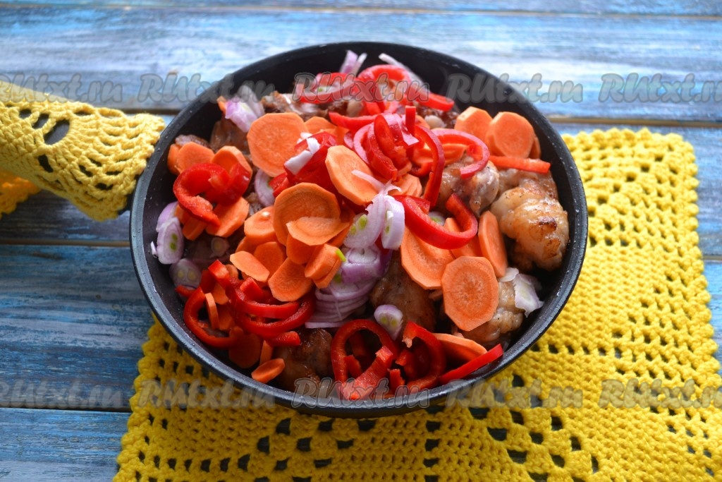 Выложить овощи на сковороду к обжаренному мясу.
