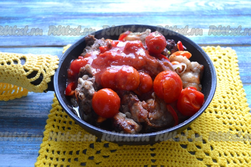 Добавить к кусочкам кролика и овощам помидоры в собственном соку. Их можно заменить обычным томатным соком или томатной пастой, разведенной холодной очищенной питьевой водой в соотношении 1:3.