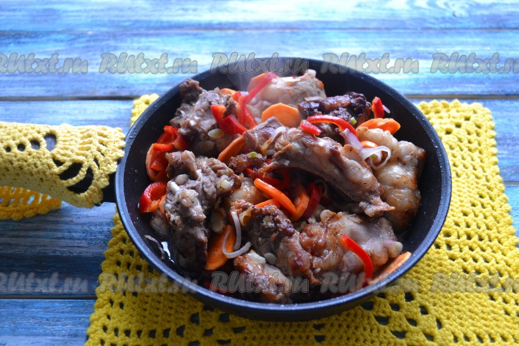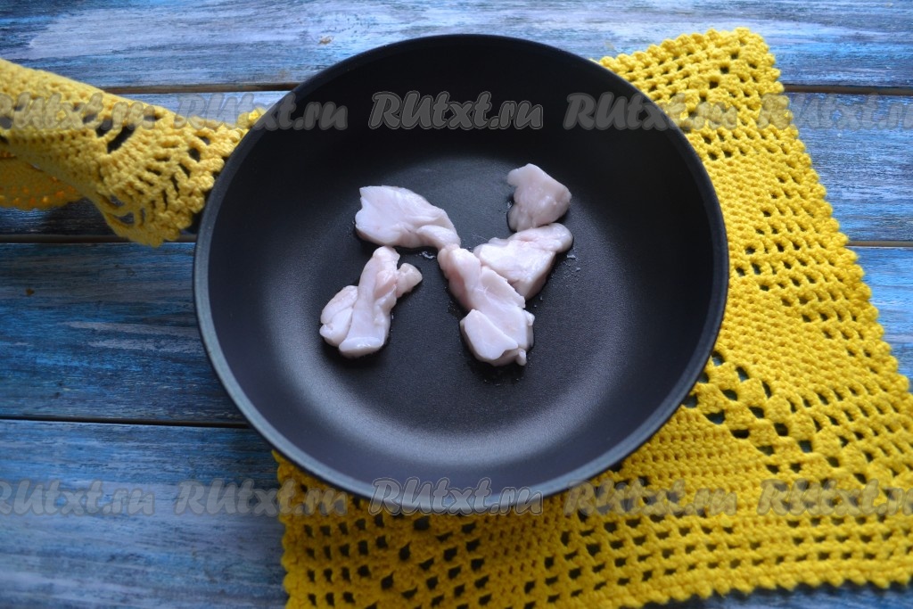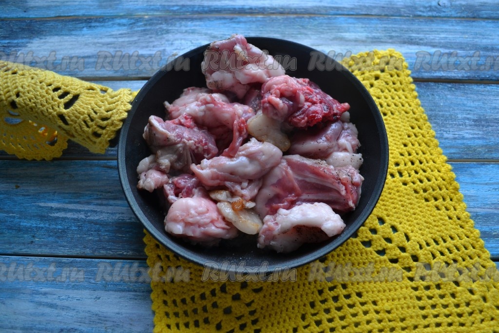 Убрать шкварки со сковороды, а на сковороду выложить кусочки кролика.