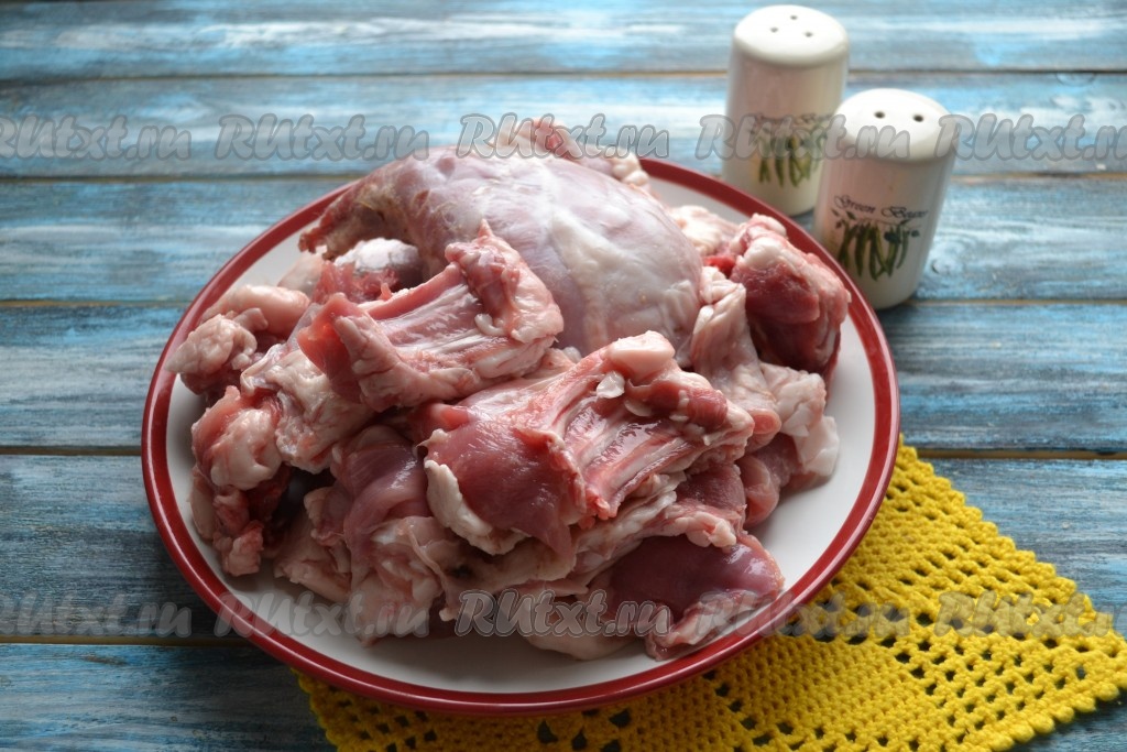 Тушку кролика вымыть и разрезать на небольшие порционные кусочки. Часть сала срезать (если оно есть), оно понадобится в дальнейшем.