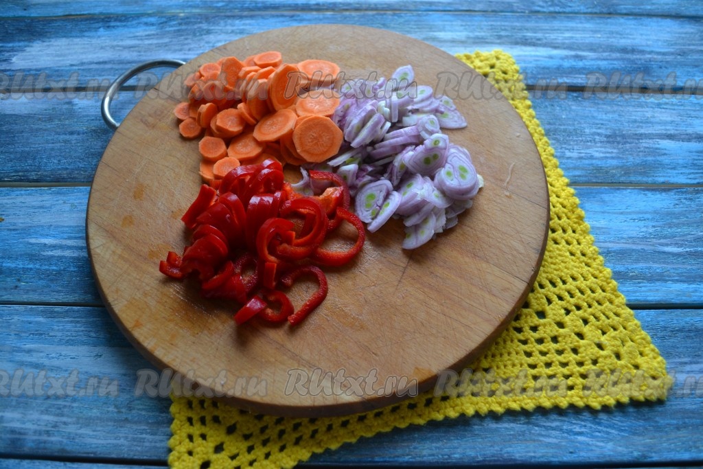 Очистить и вымыть овощи. Морковь и лук нарезать тонкими кольцами, а болгарский и острый перцы - соломкой. С острого перца необходимо тщательно вынуть косточки.