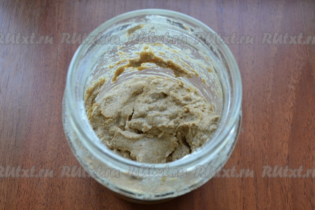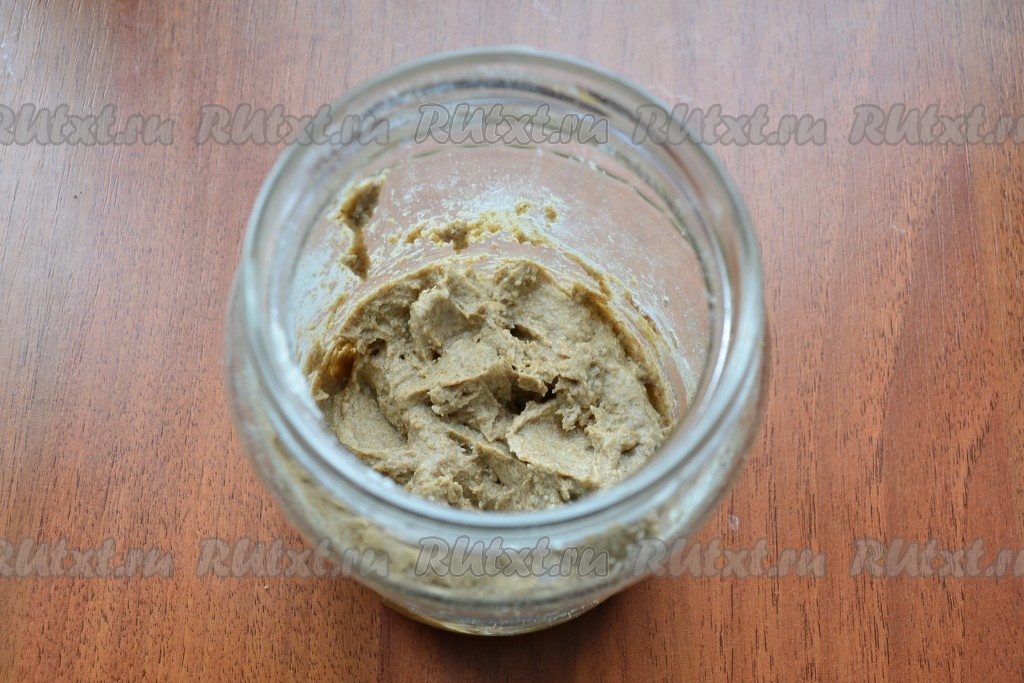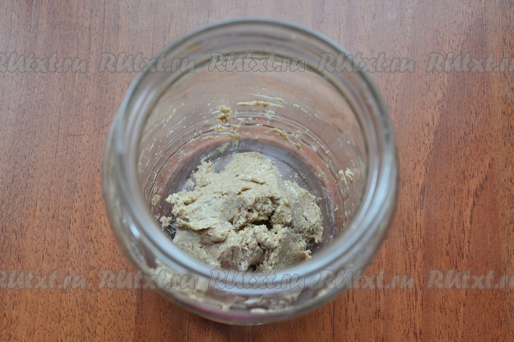 Масса получится такой же густой и вязкой. Снова накрыть банку пленкой с дырочками и поместить в тоже место еще на сутки.