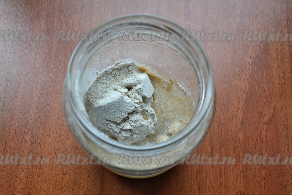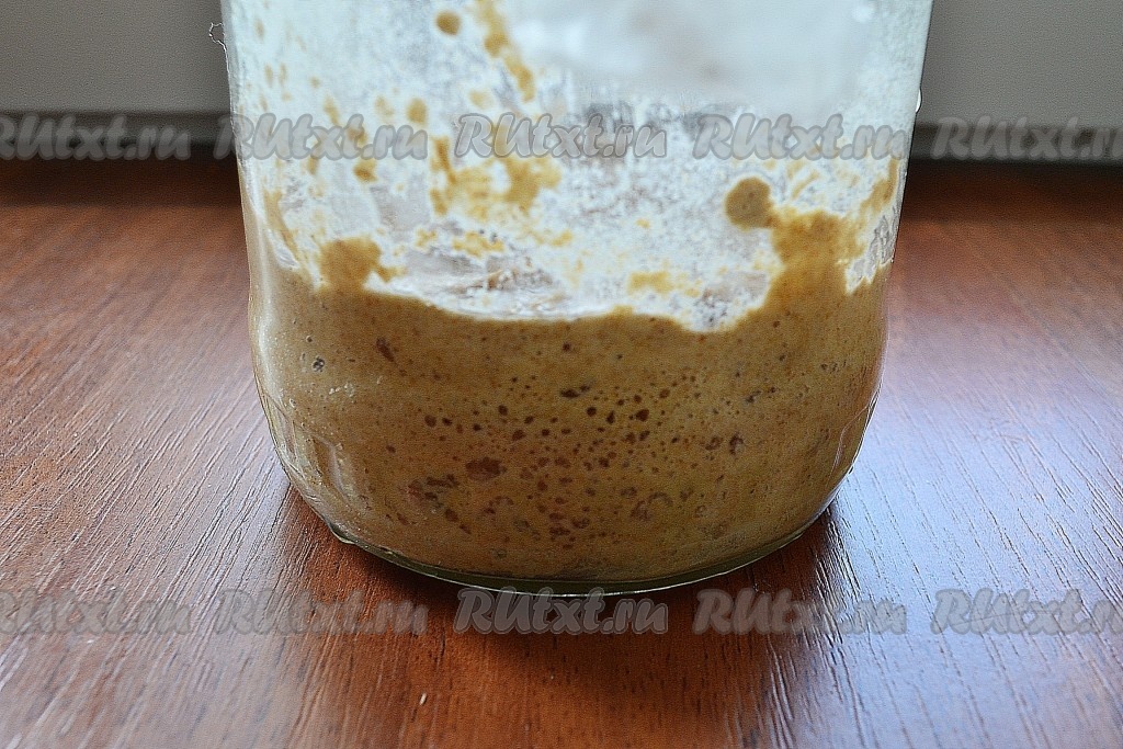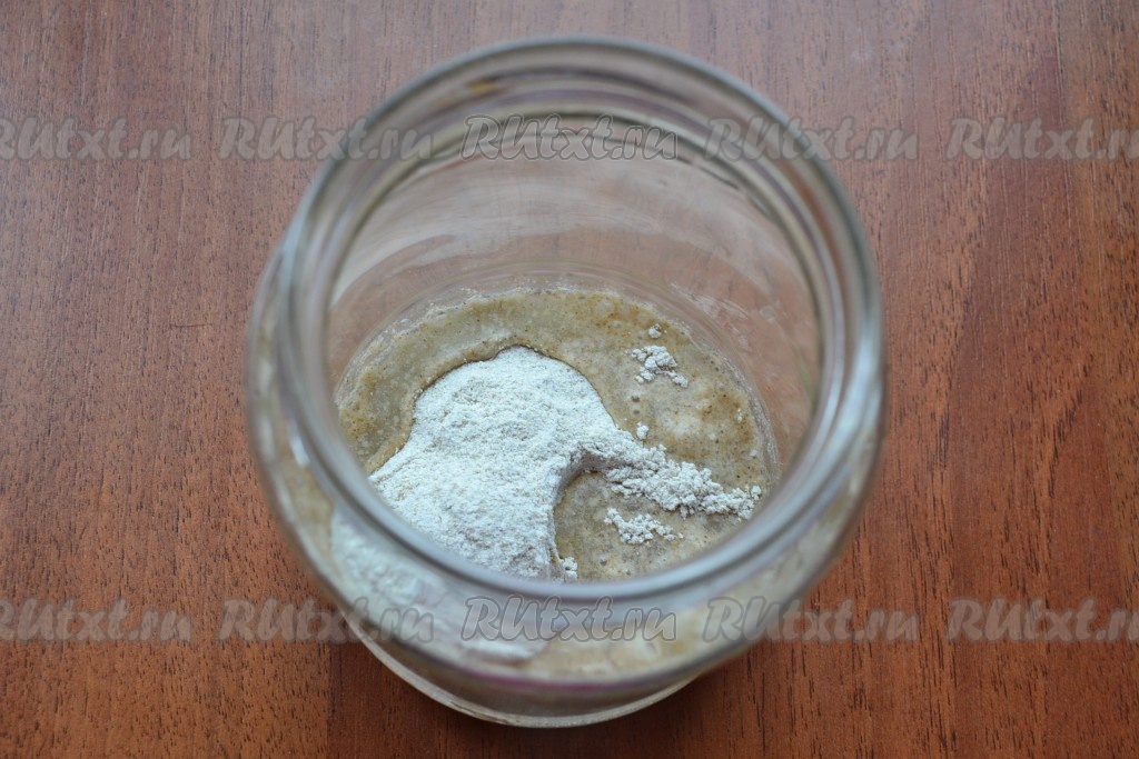 Теперь добавить в закваску 100 мл теплой воды, перемешать и всыпать 100 грамм ржаной муки. Еще раз тщательно все перемешать. Масса будет той же консистенции, что и раньше. Накрыть банку пленкой и оставить в том же месте еще на 24 часа.