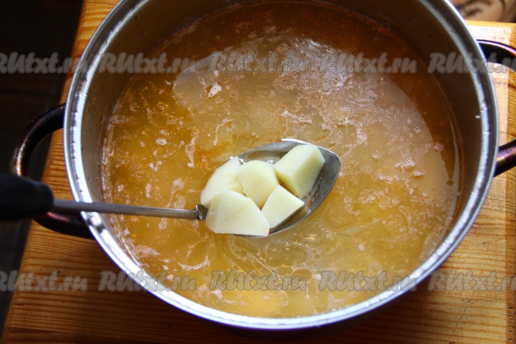 В рыбный бульон добавляем очищенный мелко нарезанный картофель и варим минут 15 (до готовности картошки).