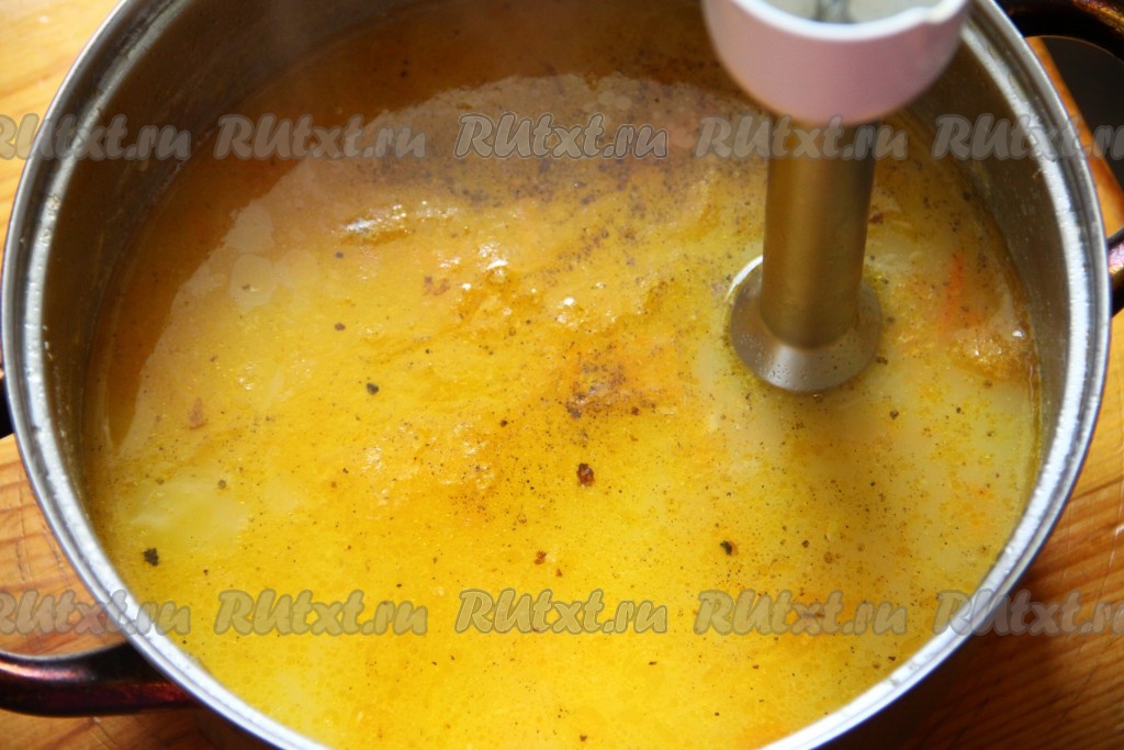 Слегка обжаренные овощи добавляем в кастрюлю с готовым картофелем и варим до полной готовности, солим суп и перчим по вкусу. С помощью погружного блендера пюрируем суп до однородного состояния.