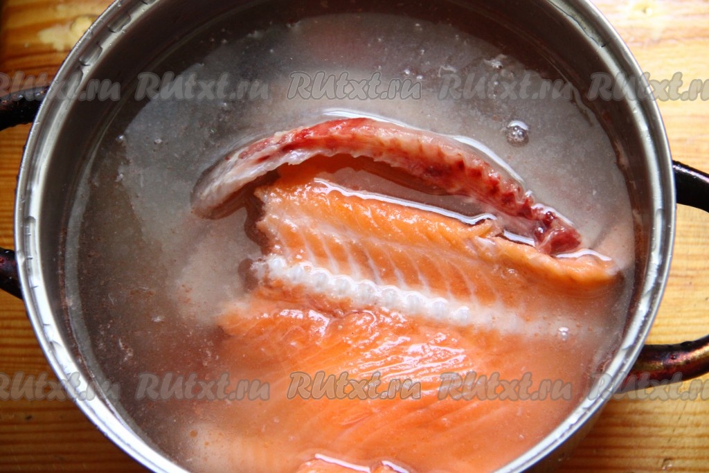 Рыбные обрезки семги заливаем водой (я готовила из хребта и головы), отправляем кастрюлю на огонь, после закипания уменьшаем огонь и варим около 30 минут на небольшом огне. По истечении времени достаем рыбу из бульона, отделяем от костей и откладываем в сторону.