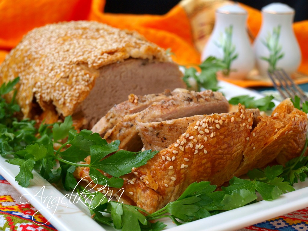 Запекать свинину в тесте 1,5 часа в разогретой духовке при температуре 180 градусов. После отключения духовки оставить там мясо ещё на 30 минут. Подать на стол как горячую закуску. Очень вкусно, попробуйте!