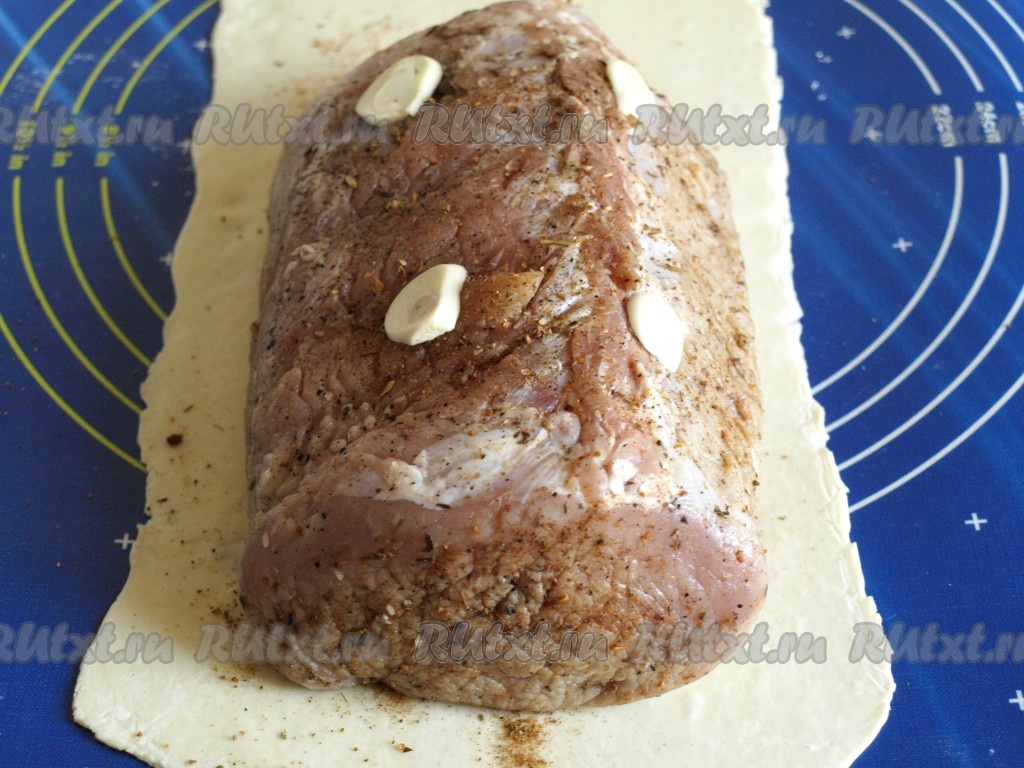 На рабочую поверхность выложить тесто, дать ему полежать при комнатной температуре 30-40 минут, затем раскатать в длину. Свинину хорошо обсушить и ещё раз притрусить приправой. Выложить на край теста таким образом, чтобы затем свободным краем накрыть мясо.