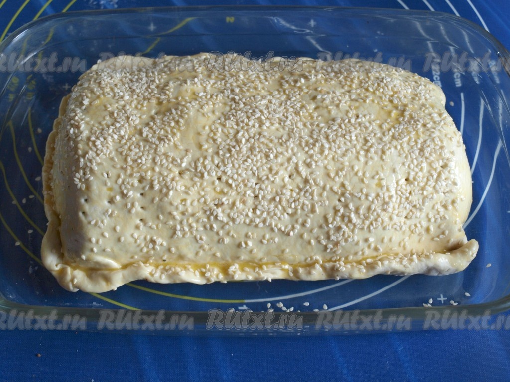 Форму для запекания смазать растительным маслом, поместить в неё мясо в тесте. Смазать тесто взбитым яйцом и посыпать кунжутом.