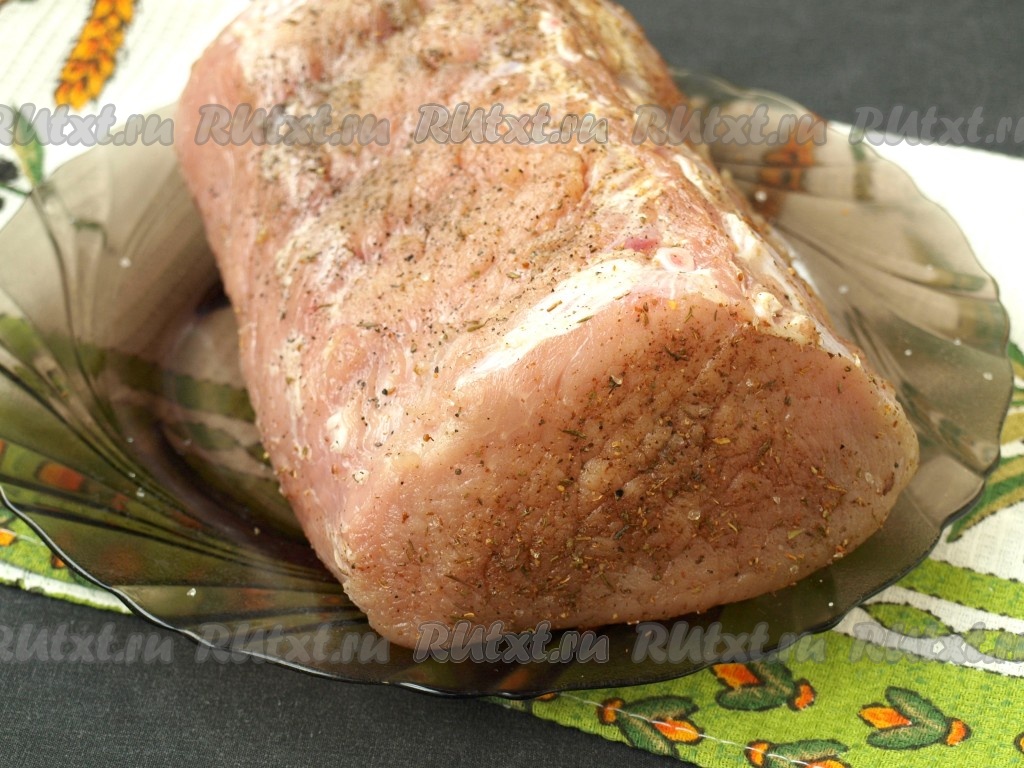 Свиной балык промыть и промокнуть бумажными полотенцами. Смешать мясную приправу с солью и перцем, хорошо натереть мясо со всех сторон.