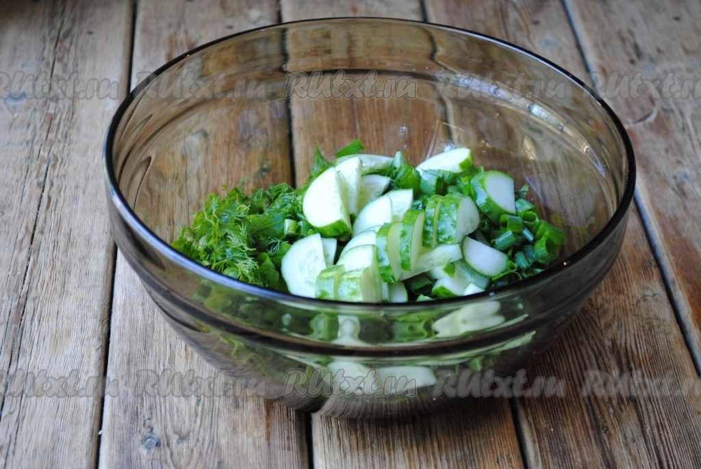 Огурцы нарезать полу кружочками и добавить к зелени и листьям салата.