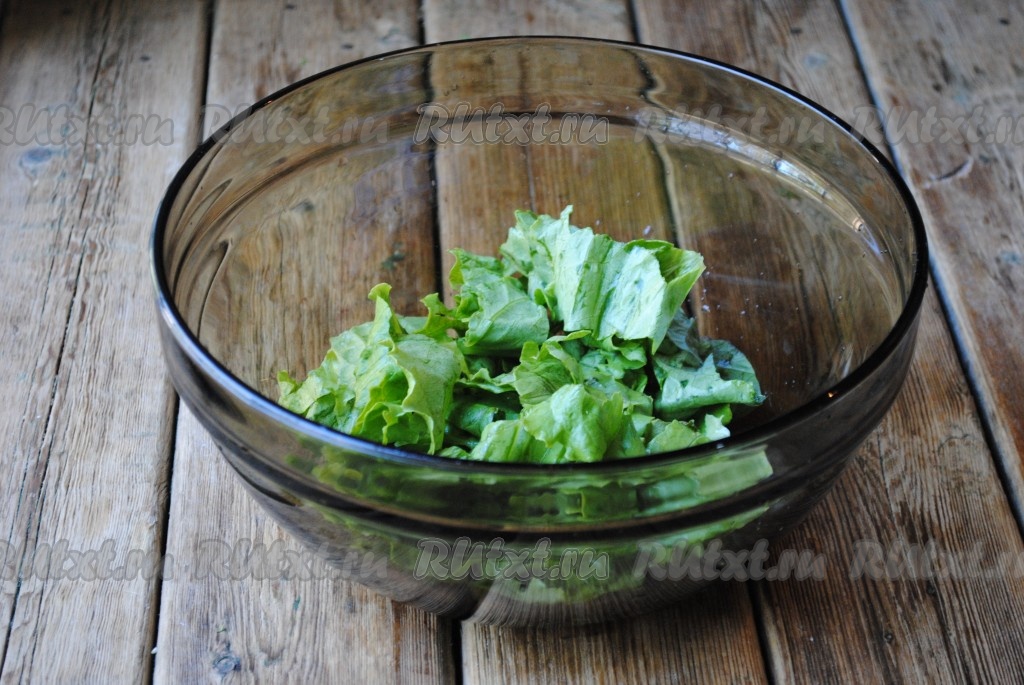 Для начала нужно вымыть всю зелень и огурцы под холодной проточной водой. Дать им обсохнуть или обмокнуть полотенцем. Затем листья салата порвать руками на средние кусочки, выложить в подходящую миску или салатницу.