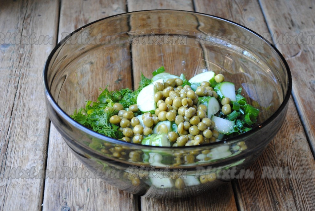 Консервированный горошек (без жидкости) отправить в миску с салатом.