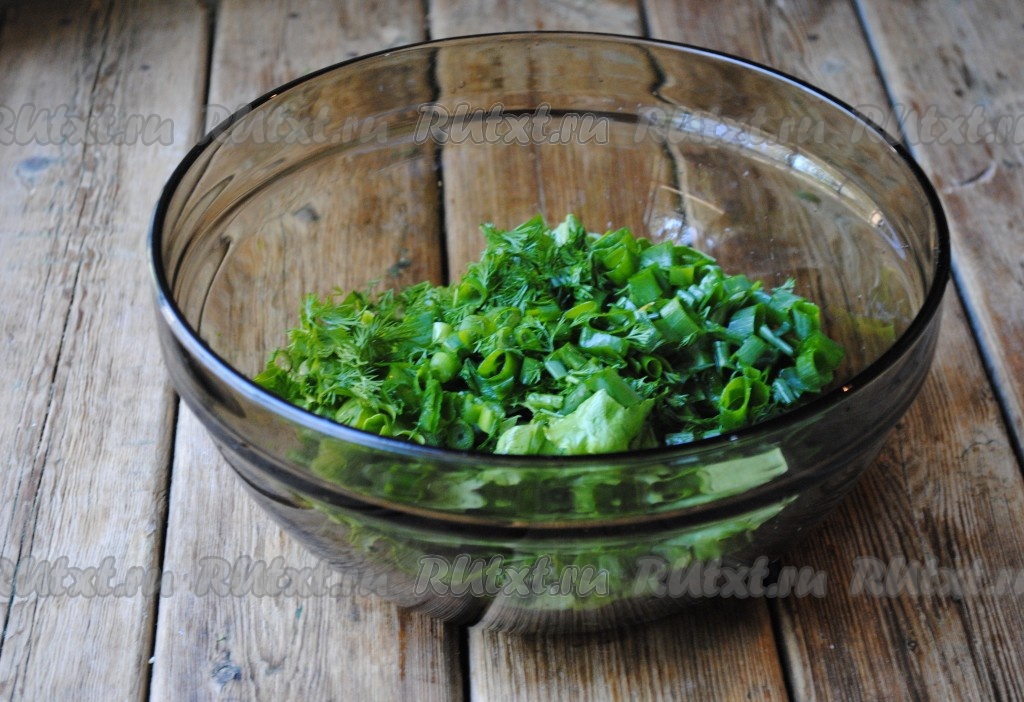Укроп и зелёный лук мелко нарезать и добавить к листьям салата.