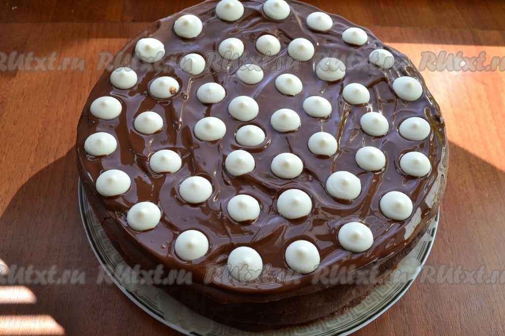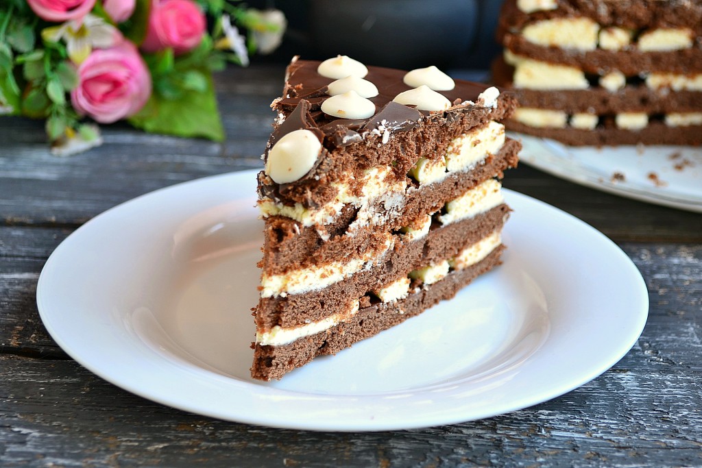 Далее, если у вас останется крем, можете верх украсить им. Я просто украсила верх каплями белого шоколада.