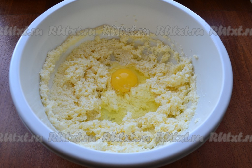 Размягченное сливочное масло взбить миксером с сахаром. Далее, продолжая взбивать, добавлять по одному яйца комнатной температуры. Взбивать все вместе около 2 минут.