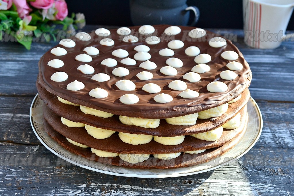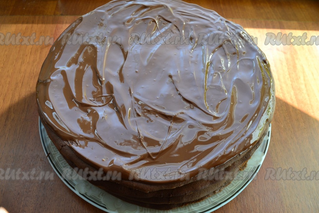 Накрыть сверху вторым коржом и таким же образом нанести крем. Также поступить и с третьим коржом. Накрыть последним коржом и его покрыть растопленным шоколадом.