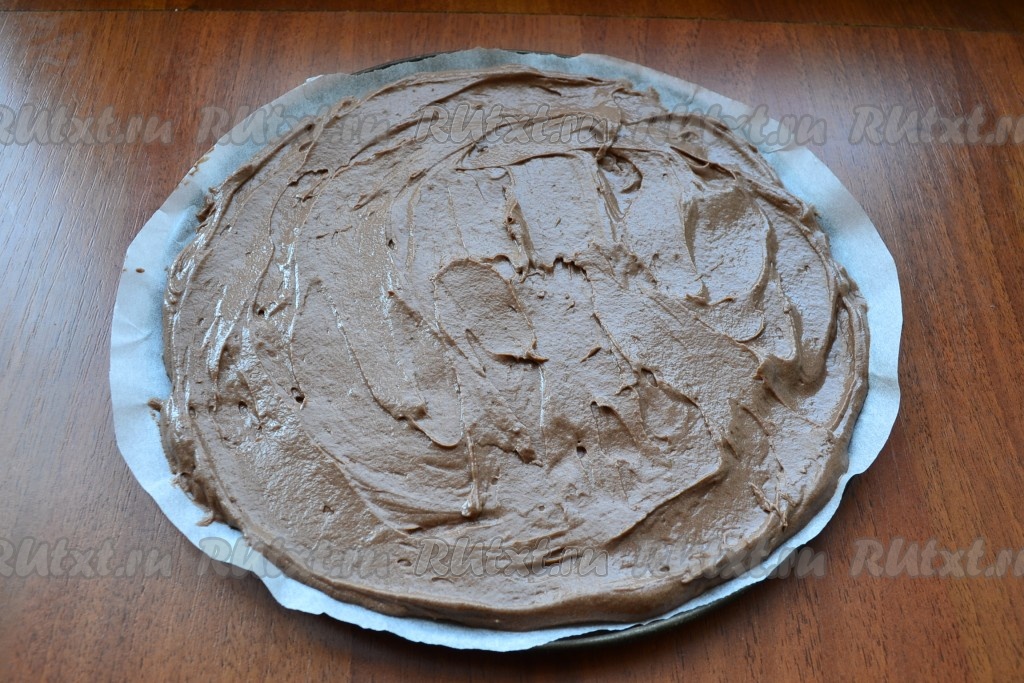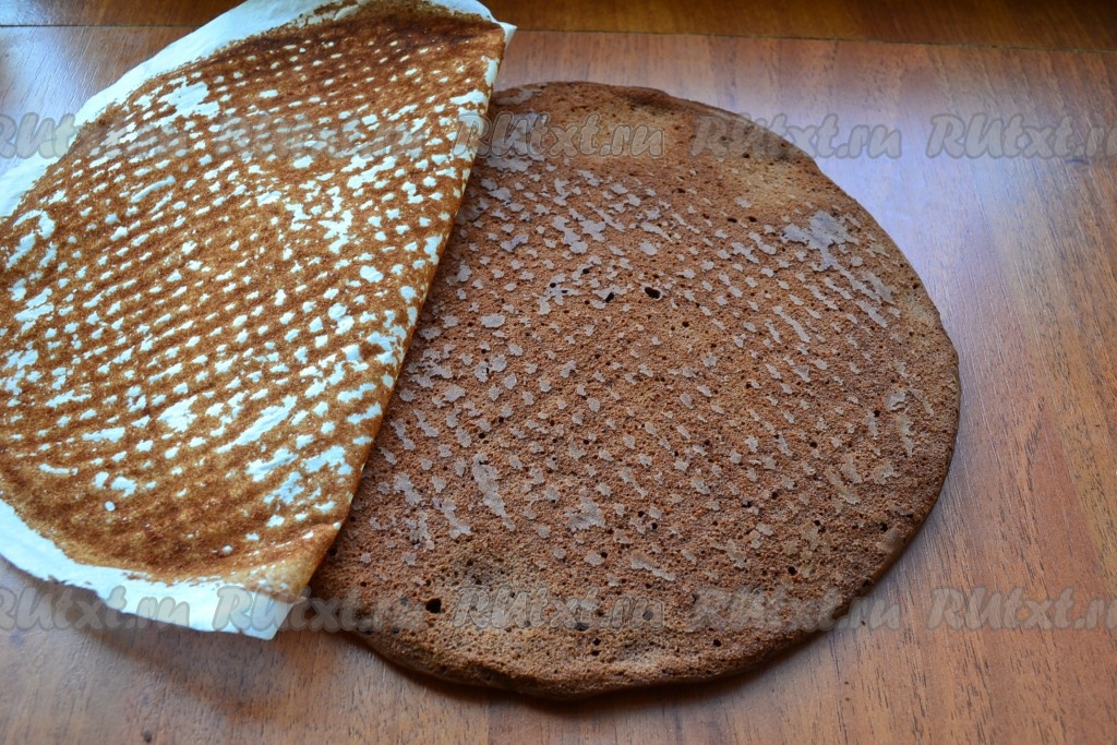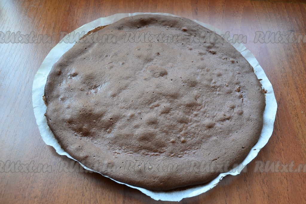Когда коржи остынут, снять пергамент. Таким образом испечь все 4 коржа.