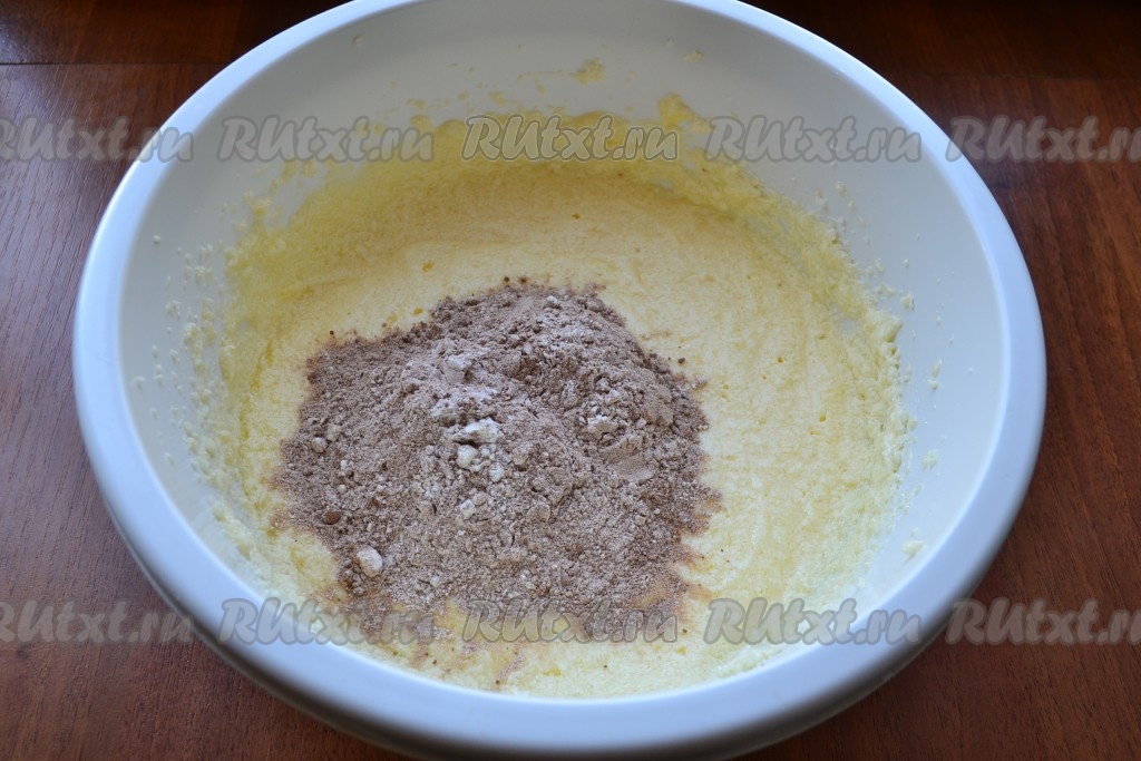 Отдельно соединить просеянную муку, какао-порошок, разрыхлитель и ванильный сахар, хорошо перемешать получившуюся сухую смесь.