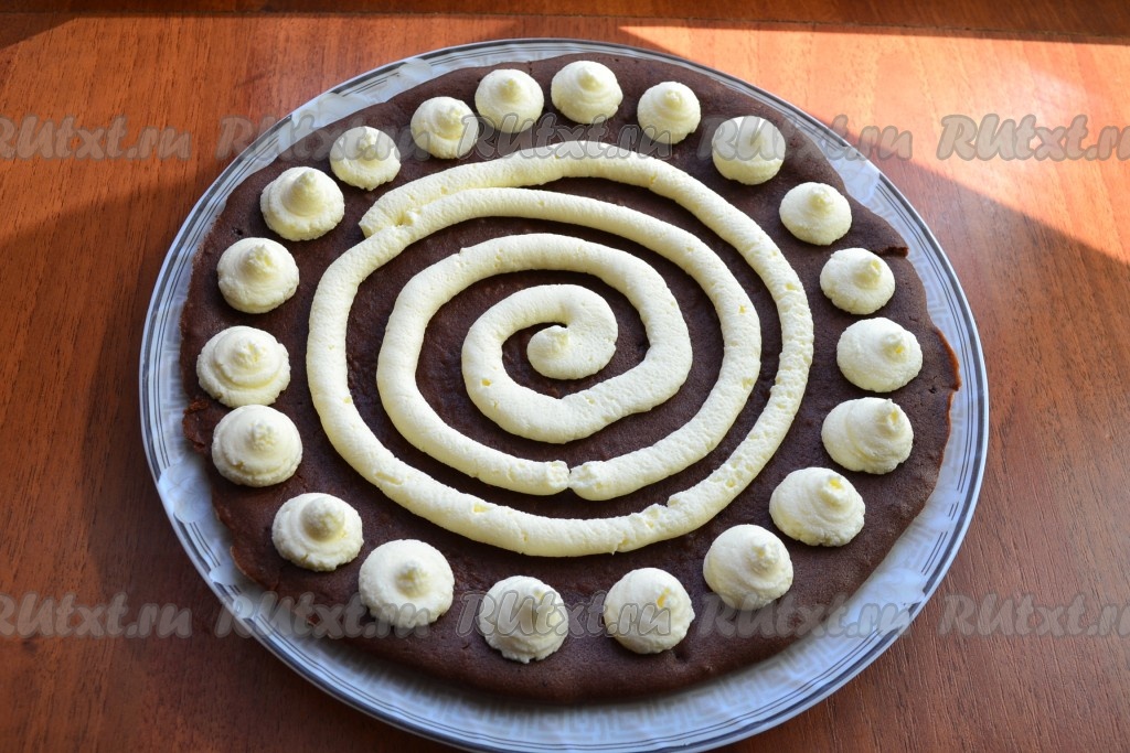 Далее нужно собрать торт "Вупи пай". На корж нанести крем таким образом: по краю коржа выдавить крем из кулинарного мешка с насадкой для эклеров в виде крупных шариков, середину заполнить спиралью из крема.
